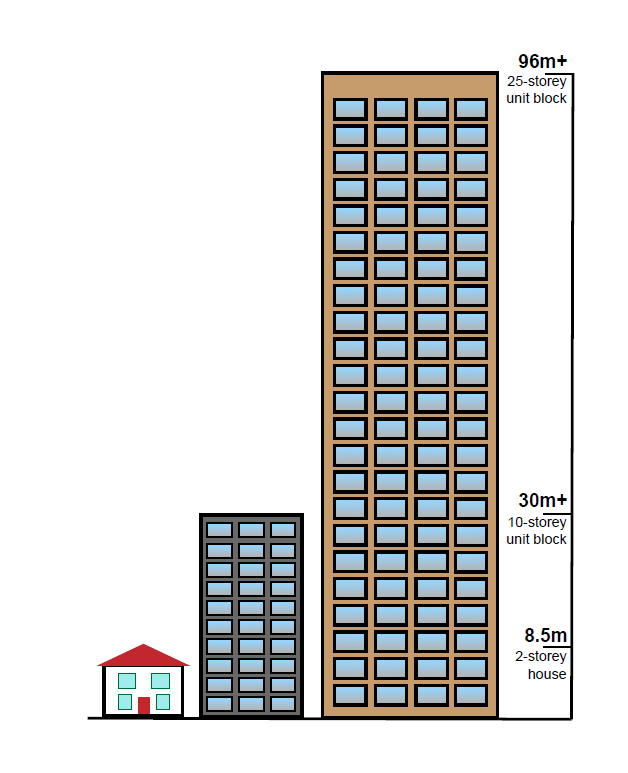 - A 25-storey+rooftop building almost three times the 9-storey height limit